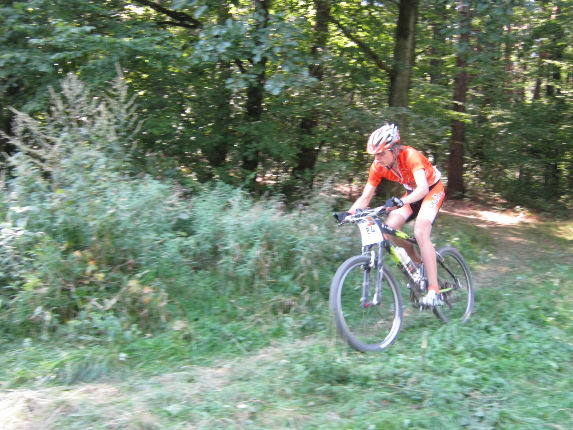 Poslední zatáčka před cílem - jede jako třetí junior.